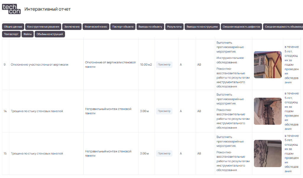 - Отчеты в среднем на 50% подробнее. По итогам обследования традиционным методом в документе инженер может обозначить дефекты, например, как «множественные трещины». В отчете с применением ПО Techcon каждая трещина будет отдельно сфотографирована и привязана к конструкции на схеме.